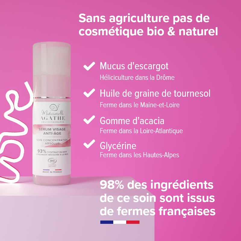 When producing cosmetic treatments, agriculture plays a central role. The majority of the ingredients in our Helicitherapy treatments come directly from French farms, whether it is snail mucus from our farm in Drôme, sunflower oil from Maine-et-Loire or acacia gum from Loire-Atlantique.