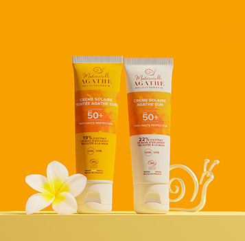 Often neglected in sun protection routines, the neck and décolleté require special attention. UV rays can cause irreparable damage, accelerating skin aging. Incorporate sun protection appropriate for these areas every day to prevent wrinkles, maintain youthfulness and ensure radiant skin. The treatments in the Agathe Sun range benefit from the soothing, regenerating and healing properties of snail slime. This substance helps calm skin exposed to oxidative stress caused by inflammation resulting from exposure to the sun.