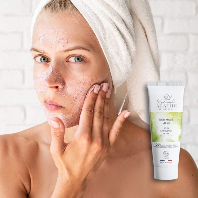 Start by removing dead skin cells with a skin-friendly exfoliant, like our Smooth Scrub . It gently refines skin texture, leaving skin brighter and more receptive to care. Then, apply one of our face masks , made with snail slime and regenerating active ingredients, to revitalize the skin and reveal its full radiance.