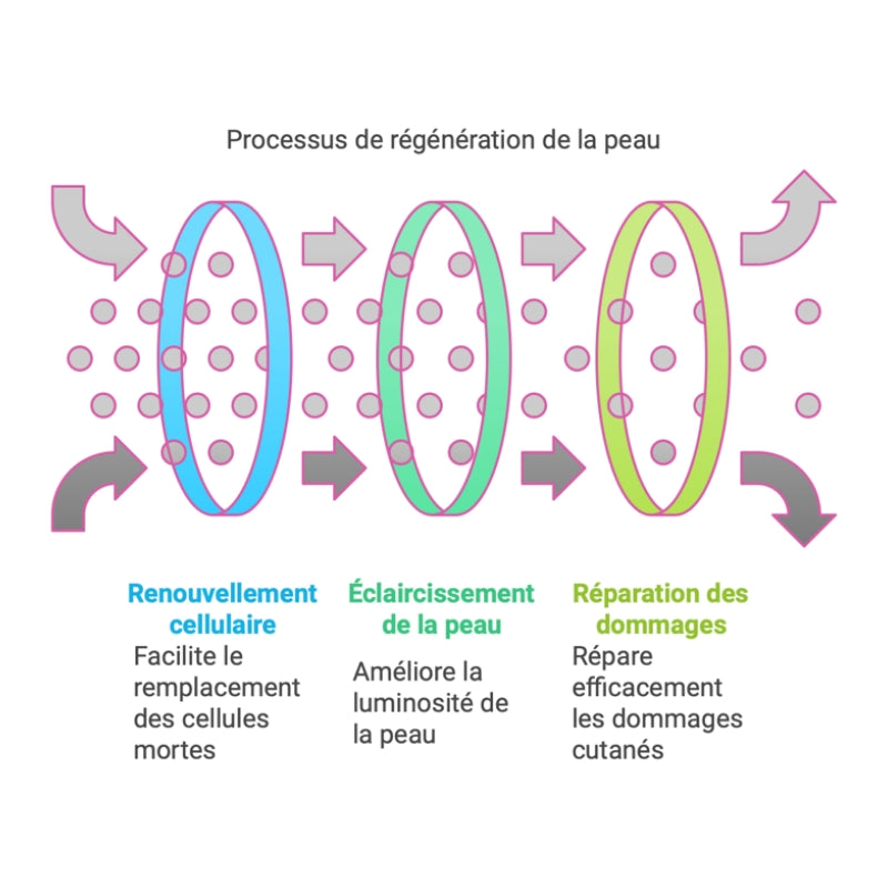 Restoring skin thickness, reducing wrinkles and improving its texture are made possible by specific molecules called cytokines, such as TGF-β1, VEGF or type I collagen. These cytokines act by reactivating skin cells called fibroblasts, which tend to age or deteriorate over time. They prevent these cells from entering "senescence" (irreversible aging) and reduce their premature death (apoptosis). Once reactivated, fibroblasts can once again produce the essential elements for young and firm skin: elastic fibers, collagen, elastin and glycosaminoglycans [12]. These components improve the elasticity, firmness and texture of the skin, while stimulating the natural production of hyaluronic acid, which intensely hydrates.