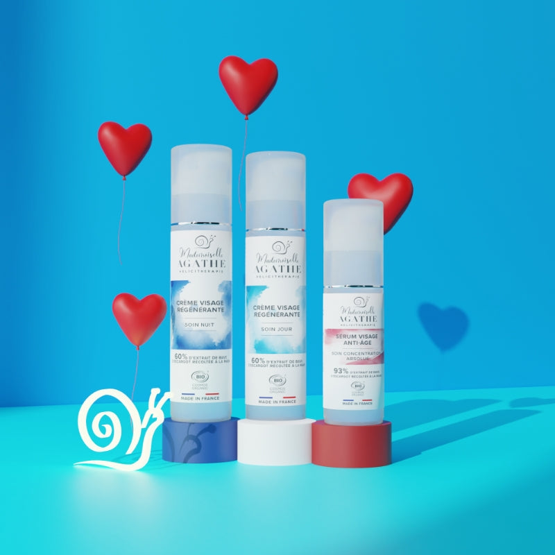 Not all snail slime cosmetics are equal. Only Mademoiselle Agathe can certify French organic farming with hand-harvested slime. Our certified organic helicitherapy treatments guarantee a healthy, natural formulation free of petrochemical oils. Our cosmetics offer optimal effectiveness thanks to the quality and quantity of slime extract, combined with organic plant ingredients sourced in the Pays de la Loire. By integrating our creams or serums into your routine, you benefit from gentle but powerful care, suitable for all skin types, even the most fragile. With regular use, your skin will be visibly smoother, hydrated and radiant, while respecting nature.