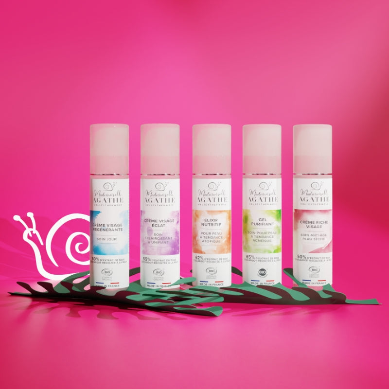 Mademoiselle Agathe offers Helicitherapy: treatments based on organic snail slime, carefully harvested with respect for animal welfare. Developed in France, our treatments guarantee an optimal concentration of active ingredients to meet the needs of the most demanding skin. Whether you are looking to cleanse, moisturize or regenerate your skin, our range offers suitable solutions to enhance your skin while respecting your values.