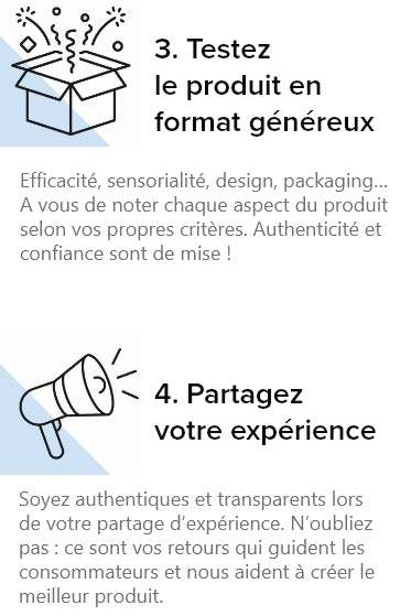 Participating in our product tests helps us to co-construct products that meet consumer expectations. Indeed, your detailed and authentic feedback allows us to develop innovative and effective products that perfectly meet the needs of our future customers: no more failed purchases or casting errors!