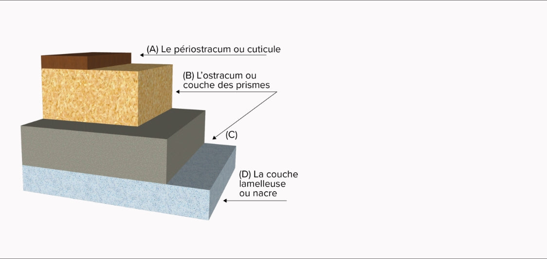• The lamellar or mother-of-pearl layer: (D) secreted by the entire dorsal surface of the mantle, it results from the regular stacking of layers of conchioline and layers of limestone made up of crystallized flakes of aragonite. All the layers are parallel to each other and to the surface of the shell, interlocking like the tiles of a roof. It is this laminated arrangement with a satin aspect and these metallic colors characteristic of mother-of-pearl.